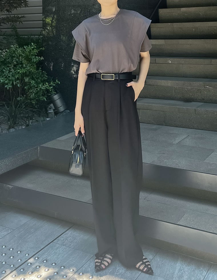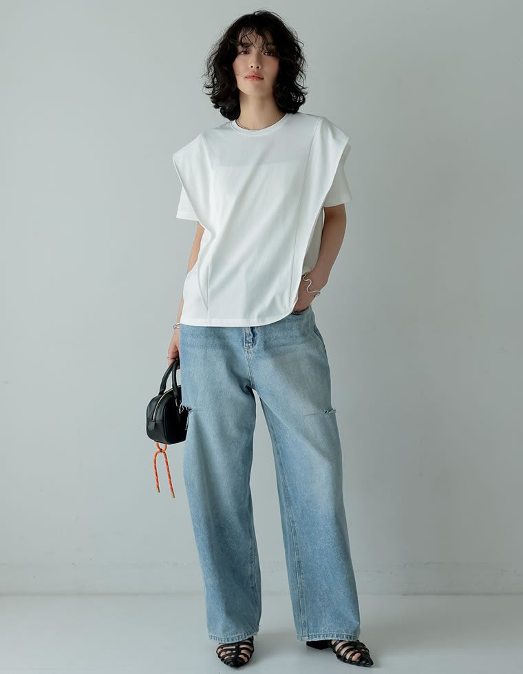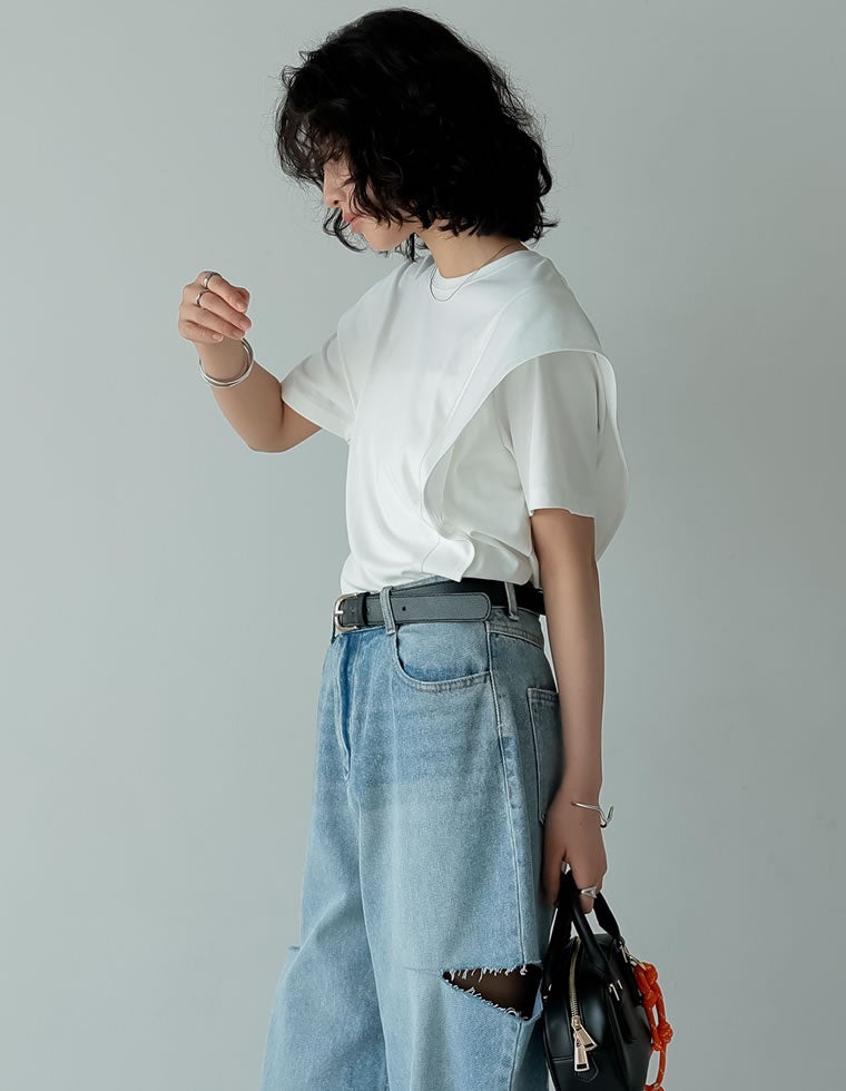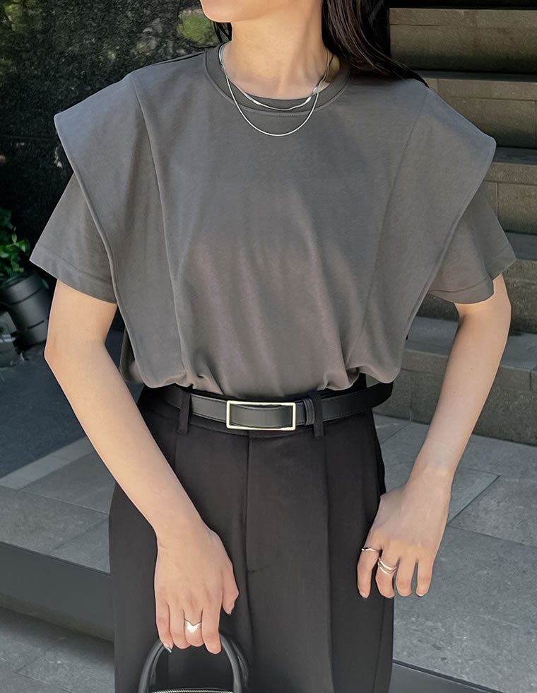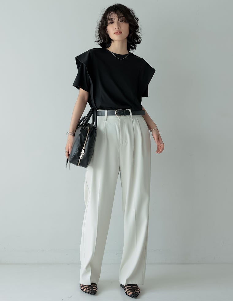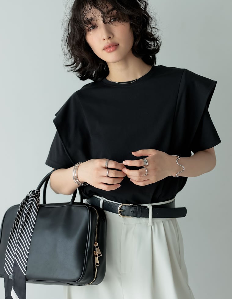 大人モードに決まるラッフルショルダーTシャツ