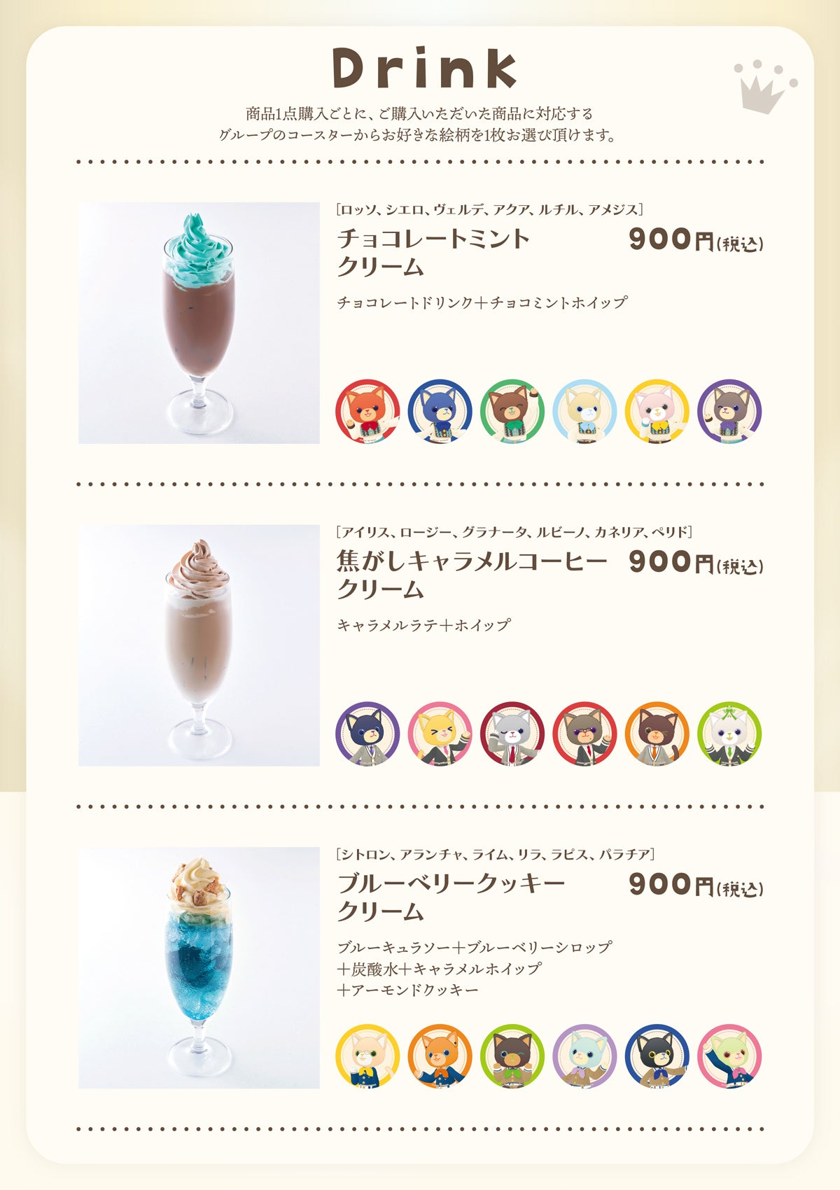 ドリンクは対応するグループのコースターからお好きな絵柄をお選び頂けます。