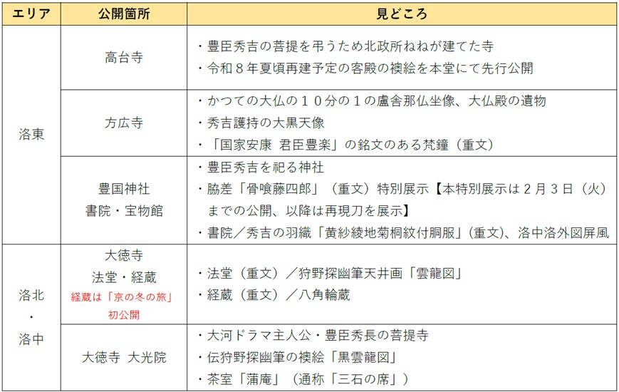 昭和42年1月に始まった本企画は、令和8年に第60回を迎えます。今回は、大河ドラマ「豊臣兄弟!」の主人公・豊臣秀長と兄・秀吉ゆかりの地をテーマに、15件の貴重な非公開文化財を特別公開します。また、定期観光バスやタクシーで巡る特別コースのほか、京都の歴史や文化をより深く楽しめる体験プラン、60回記念の特別企画など、多彩で充実した内容で展開します。