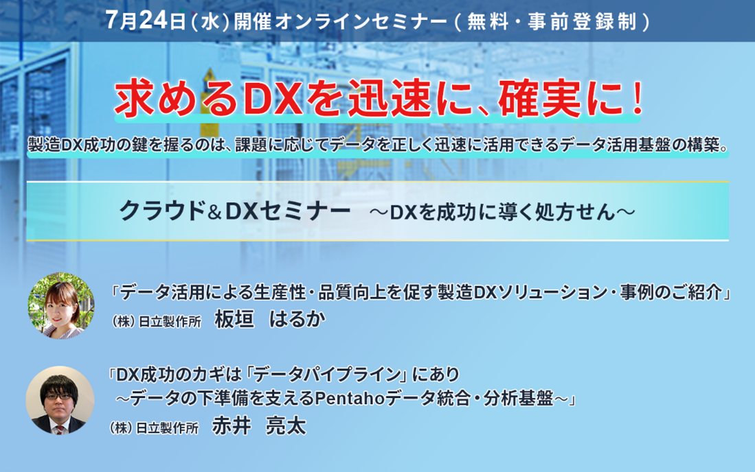 株式会社日立製作所(以下、日立)は、製造業をはじめとするDX推進やデータ活用の課題をお持ちの方向けに、DXを成功に導く「処方せん」と題する無料オンラインセミナーを7月24日に開催します。