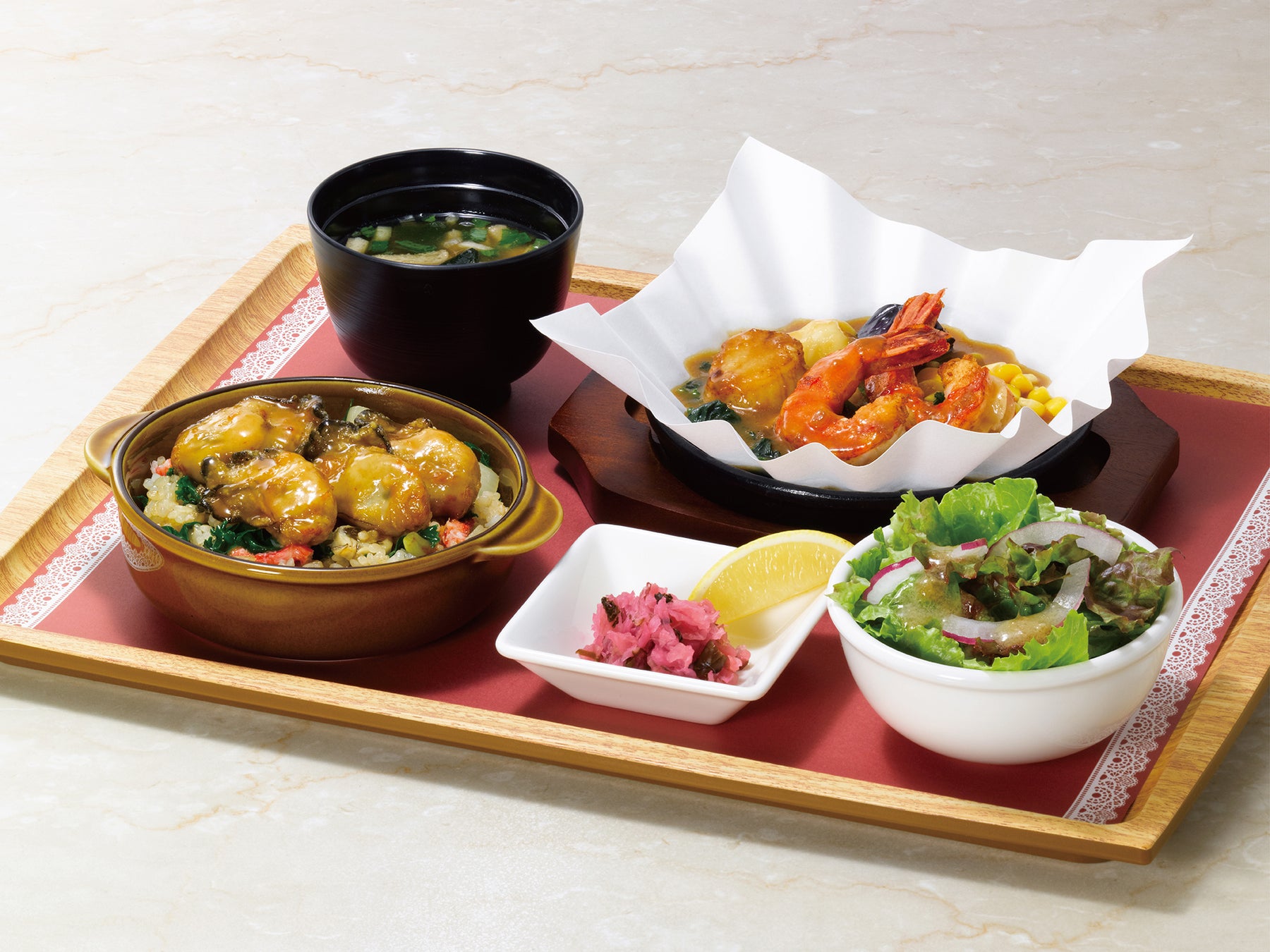 ジューシーかつプリプリ食感の蒸し牡蠣を贅沢に4粒のせ、国産紅ずわい蟹も入ったピラフが、グリルと共にお楽しみいただける「牡蠣と蟹の和風ピラフ&海老と帆立のあつあつグリル」。黒毛和牛使用の「黒毛和牛ステーキご飯&海老と帆立のあつあつグリル」、定番の「黒×黒ハンバーグ」に牡蠣とほうれん草とマカロニのグラタンを添えた「黒×黒ハンバーグ&牡蠣とほうれん草のマカロニグラタン」が登場。「牡蠣と帆立とほうれん草のクリームスパゲティ」では牡蠣に北海道産帆立を加えクリームベースのパスタと和えることで、牡蠣の旨みと海鮮の風味をより感じる味わいに。表面はかりっと中はふっくらのままに仕上げた「牡蠣のかりっとフリット」、「牡蠣ときのこのガーリックオイル煮込み〜アヒージョ〜」、「牡蠣とほうれん草のちいさなマカロニグラタン」は、「日本ワイン」によく合うラインアップです。