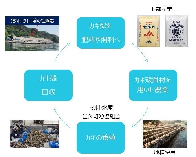 牡蠣の殻から身までを余すことなく活用した、持続可能な生産サイクルを確立。剥いた後の牡蠣殻は、マルト水産のグループ会社である卜部(ウラベ)産業が農作物の肥料、採卵鶏の飼料として販売しています。循環サイクルを確立したことによりSDGsにも配慮した養殖を実現しました。