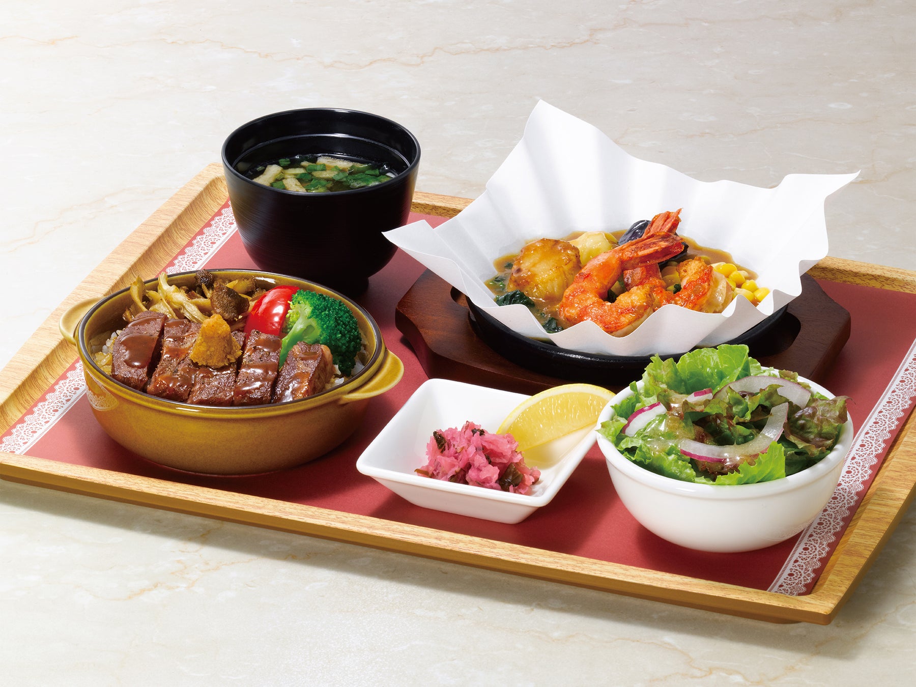少し甘みのあるステーキだれをかけたご飯に柔らかく焼き上げた黒毛和牛のステーキをのせ、香り高い山わさびをトッピング。 風味豊かな舞茸とぶなしめじの素揚げと彩りのパプリカを添えました。海老と帆立のあつあつグリルとご一緒にお楽しみください。