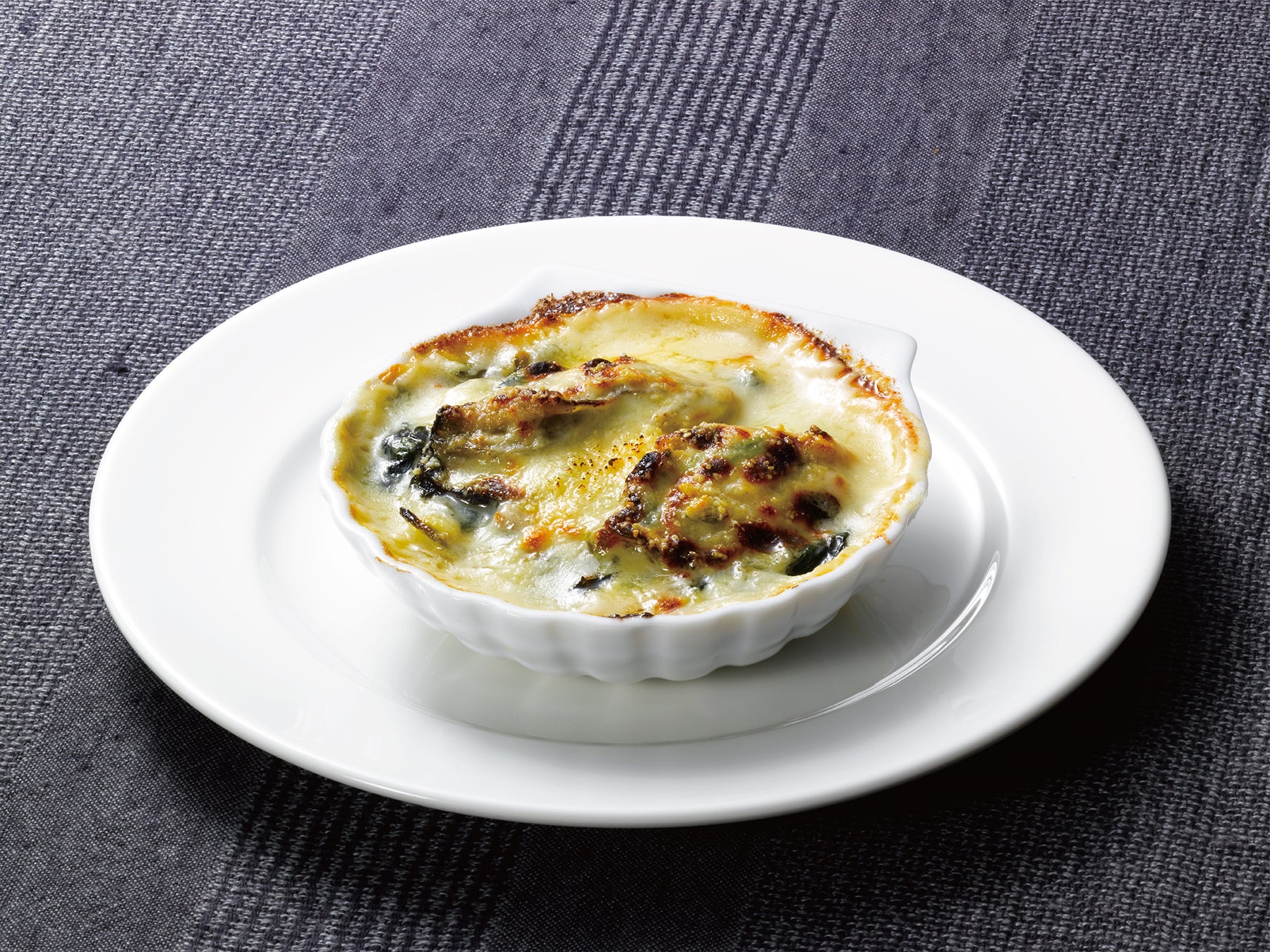 牡蠣とほうれん草、マカロニにホワイトソースとチーズをのせて焼いたちいさなグラタンです。軽食として、またパンを追加してなど、さまざまな食べ方を楽しめるサイドディッシュです。ワインとの相性も抜群、ぜひご一緒にお楽しみください。