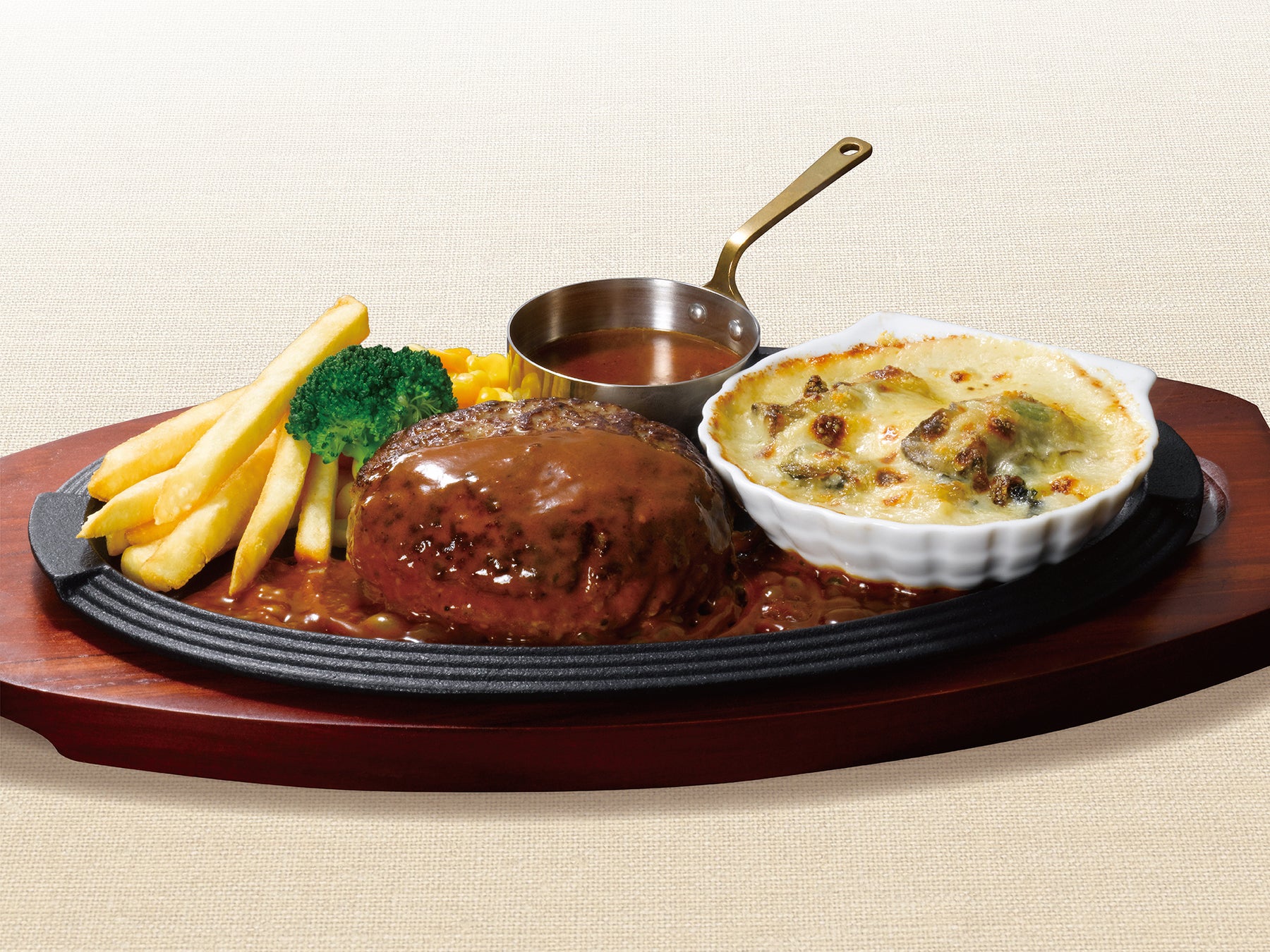 ふっくら蒸し上げプリプリとした食感とジューシーさが特徴の播磨灘産の「牡蠣とほうれん草のマカロニグラタン」と、ロイヤルホスト定番の黒×黒ハンバーグをセットにしました。牡蠣のグラタンもハンバーグも両方楽しめる商品です。