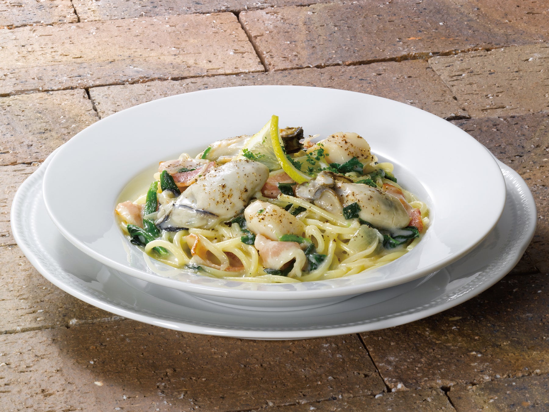ふっくらとした牡蠣と北海道産の帆立、ベーコンをソテーしたクリームベースのソースです。モチモチの麺と素材にソースがよく絡み、牡蠣の旨みをより感じます。お好みでレモンをかけるとコクのあるパスタがさっぱりとお召し上がりいただけます。