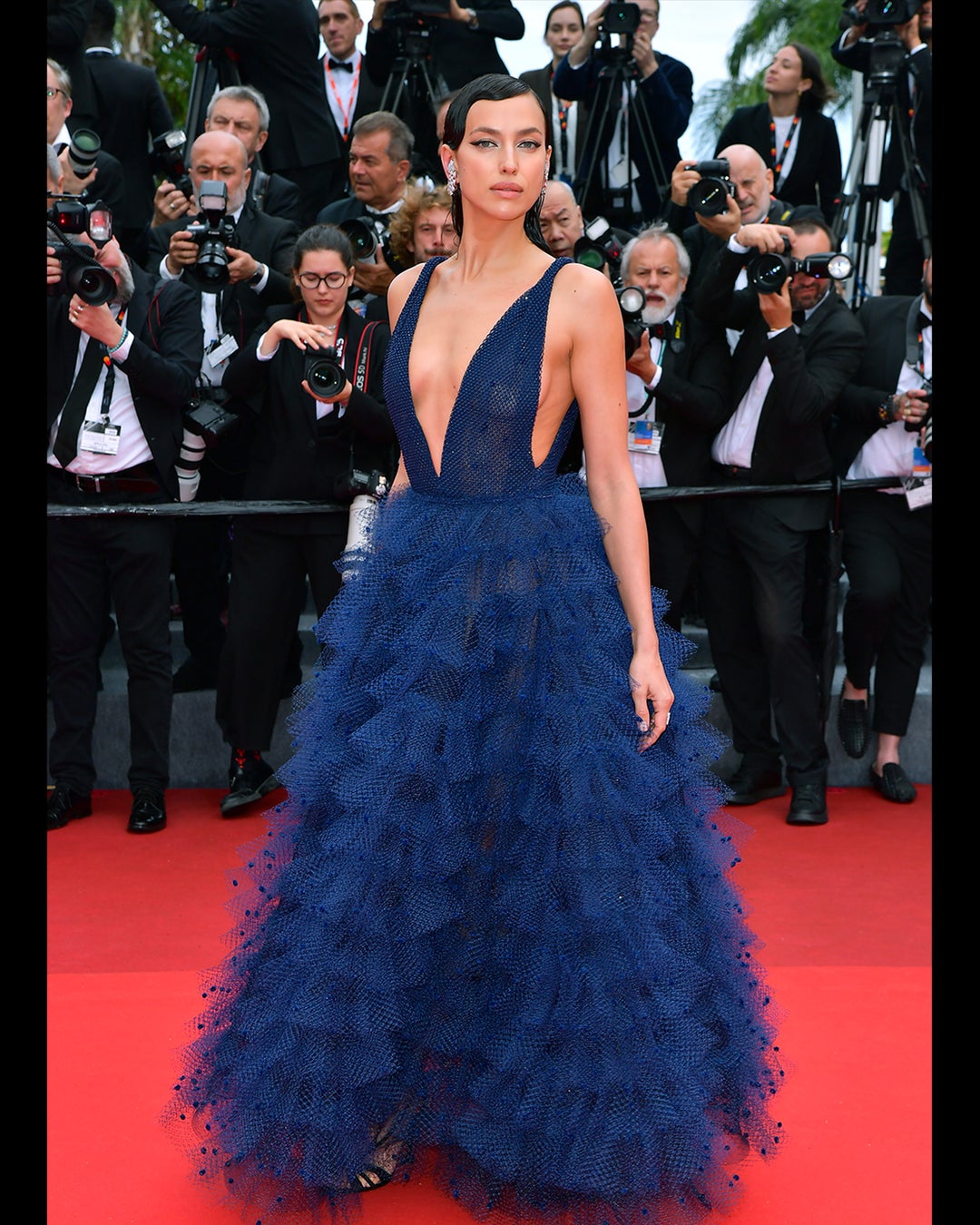 名匠マーティン・スコセッシ監督の最新作「Killers of the Moon(原題)」に出演している、Robert De Niro(ロバート・デ・ニーロ)、Robbie Williams(ロビー・ウィリアムズ)は、スコセッシ監督と共にジョルジオ アルマーニのタキシードを着用、そして先シーズの広告ビジュアルにも起用されたIrina Shayk(イリーナ・シェイク)は、ネイビーカラーでスカートのチュールのラッフルデザインが美しいジョルジオ アルマーニ プリヴェを、モデルのAlessandra Ambrosio(アレッサンドラ・アンブロジオ)は、シルエットが美しいジョルジオ アルマーニの1994年のヴィンテージのドレスをそれぞれ着用して登場し、ひと際会場を沸かせました。