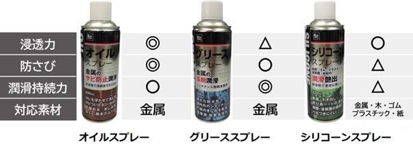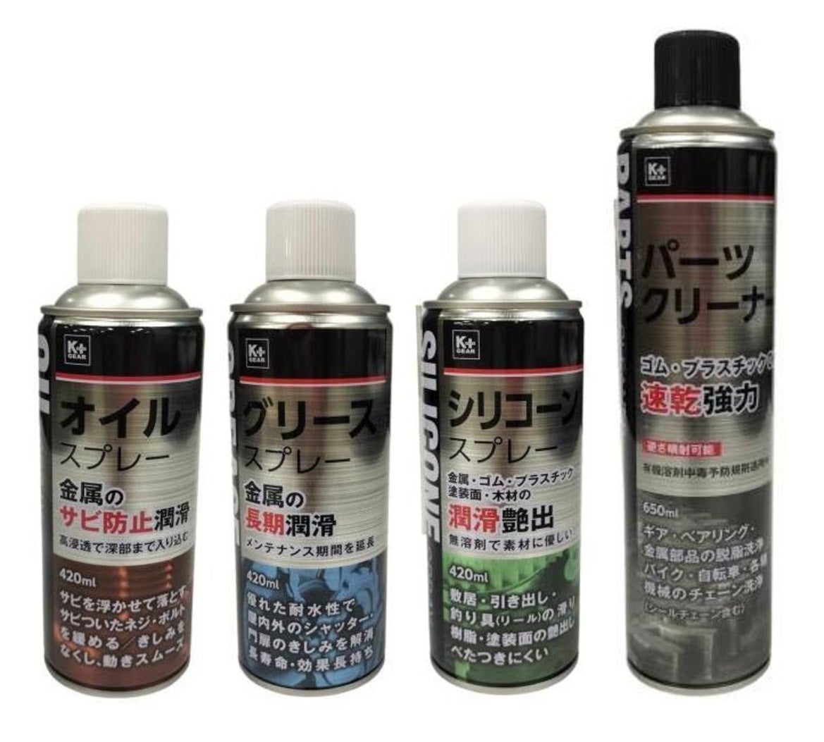 この度コメリオリジナルブランド「K+(ケープラス)GEAR」より発売された、「オイルスプレー 420ml」、「グリーススプレー 420ml」、「シリコーンスプレー 420ml」、「パーツクリーナー 650ml」は、お手入れしたい場所にあわせて、ピッタリの製品をお選びいただけます。