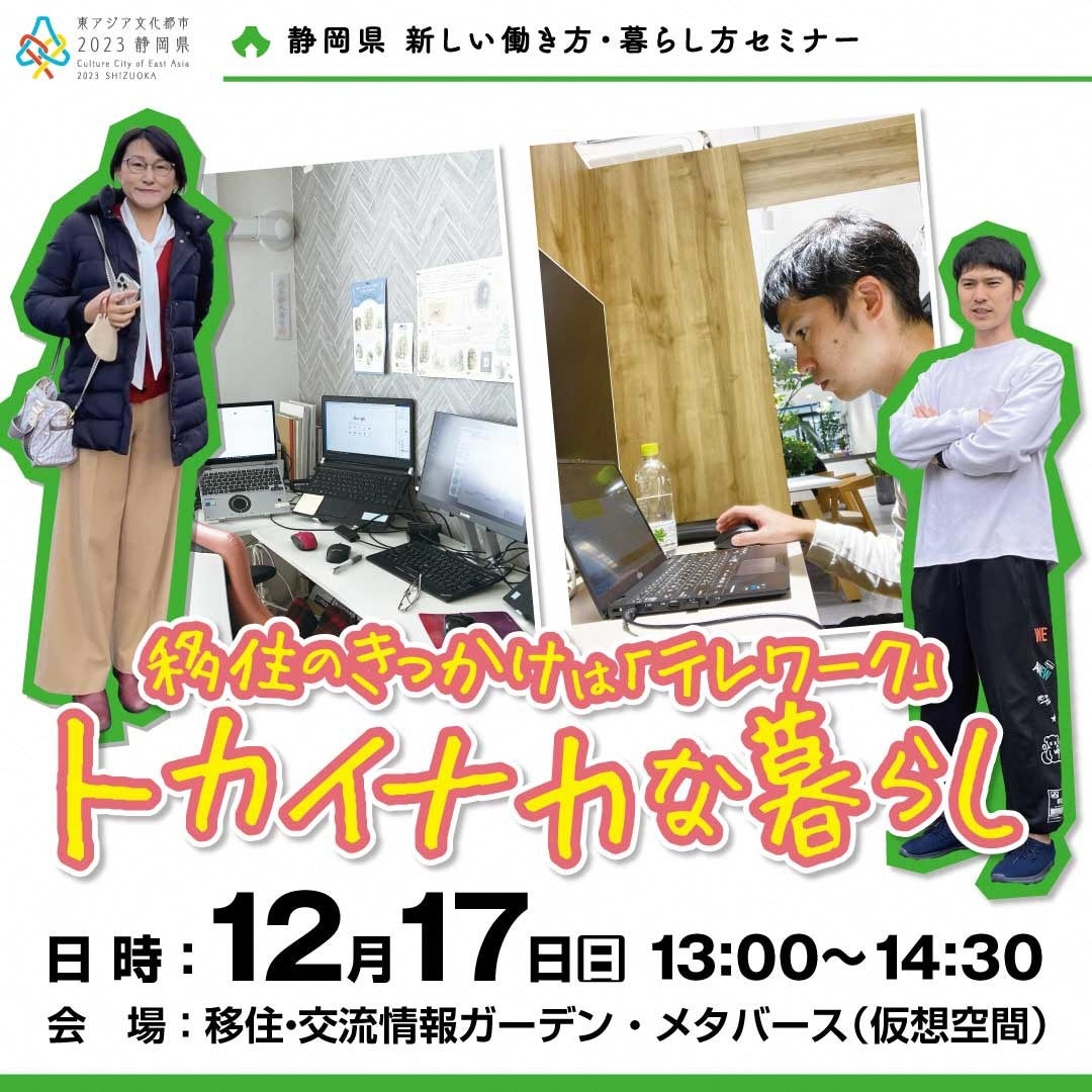 静岡県内に移住して、リモートワークで仕事をしながら、県内での暮らしを満喫している先輩移住者の方をゲストにお招きし、移住を決めたきっかけや移住の経緯、お仕事や生活スタイルなど、現在の様子をお話しします。
