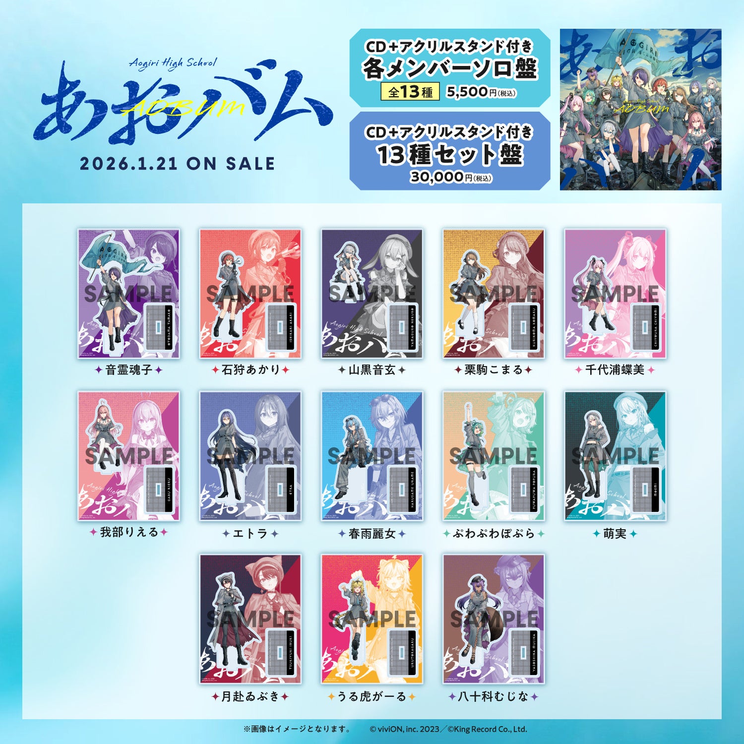 また、メジャー1stアルバム『あおバム』の発売にあたり、EVIL LINE RECORDSの公式オンラインストア『ELR Store』で販売される各メンバーソロ盤/13種セット盤に付属するアクリルスタンドのデザインと、法人別オリジナル特典のデザインも公開中です。
