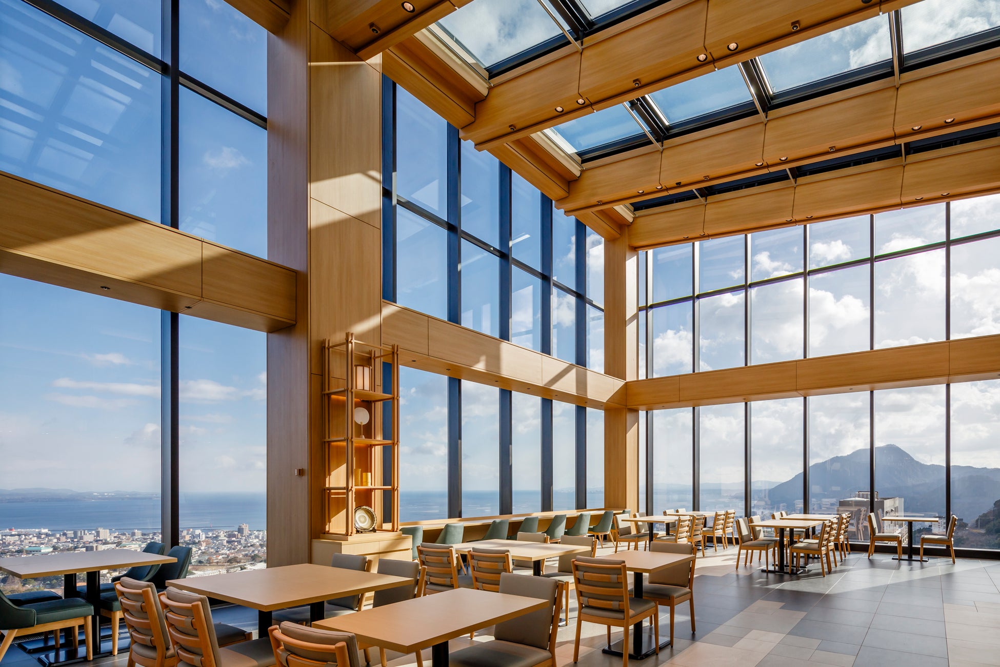 一番の魅力は、杉乃井ホテルで一番に近いレストラン「和ダイニング星 HOSHI」。最上階のエレベーターを降りてすぐ目に留まる壁画アートは、日本庭園の枯山水をモチーフにしたリアルな擬岩に、水・空・星をイメージしたプロジェクションマッピングが、レストランにお越しいただく皆さまをお迎えします。レストラン内の壁面はガラス張りに、高さ約6mの天井は一部が天窓になっており、開放感溢れる空間にて別府湾や別府の街並みを眺めることができます。また、古民家に飾ってあった古材をそのまま再利用した欄間が、現代の空間にも温かみと風情を加え落ち着いた印象を演出します。