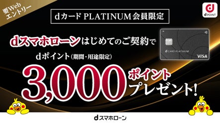 2024年11月25日から、dスマホローンを初めてご契約いただいた「dカード PLATINUM」会員のお客さまを対象に、dポイント(期間・用途限定)を3,000ポイント進呈する「【dカード PLATINUM会員限定】dスマホローンはじめてのご契約で、3,000ポイントプレゼント!」キャンペーンを開催しております。