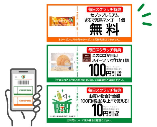 期間中、1日1回、アプリを起動することで参加でき、抽選で人気のアイス「セブンプレミアム まるで完熟マンゴー」1個無料クーポンや対象のスイーツ100円引きクーポン、お買い物10円引きクーポンが当たります。セブン‐イレブン人気商品のクーポンが当たるキャンペーンとなっており、毎日“ワクワク”“ドキドキ”の体験をお届けします。