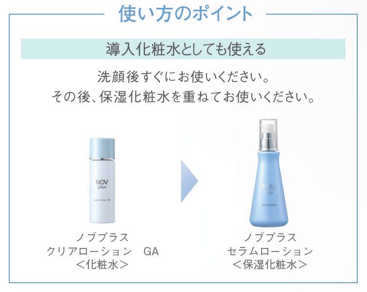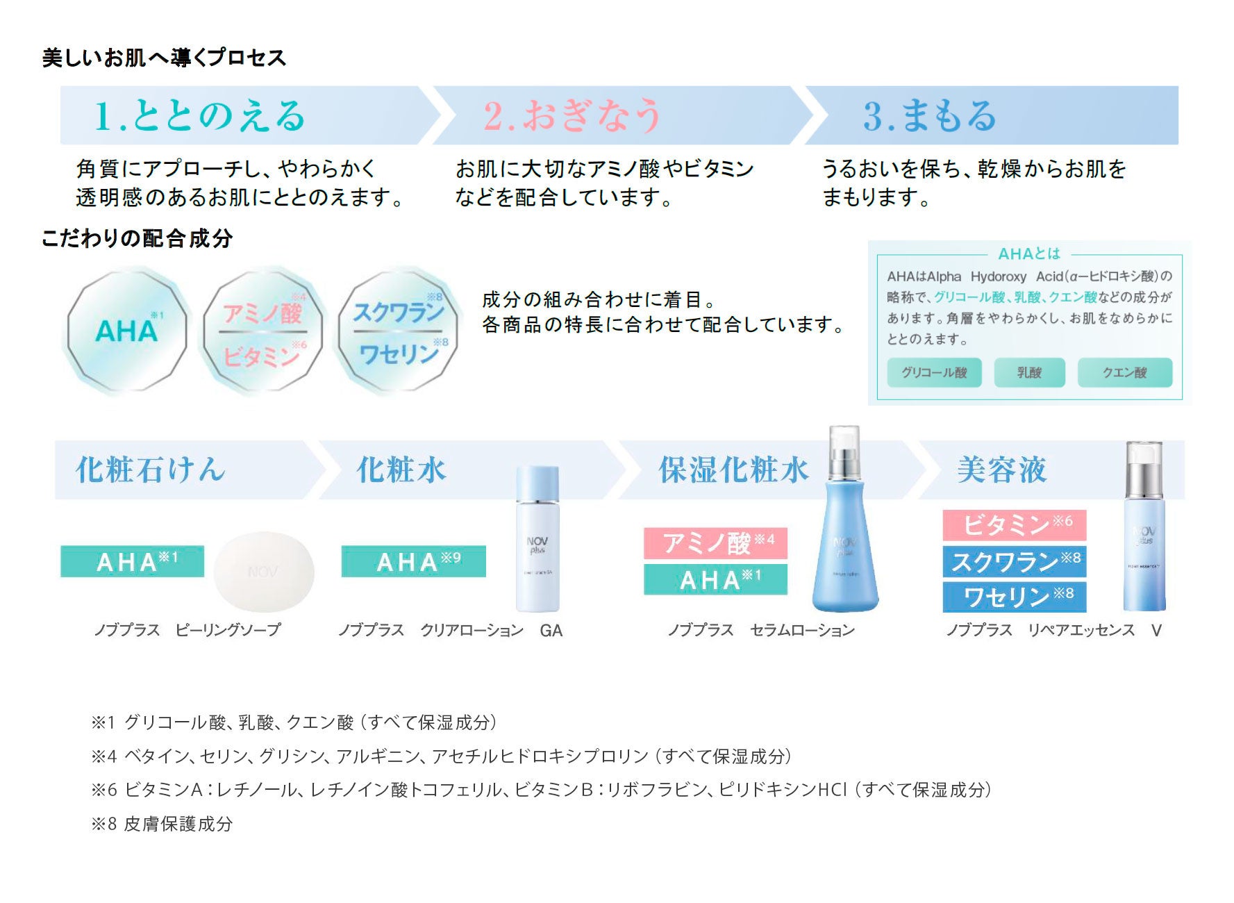「ノブプラス ピーリングソープ」にはAHA※1配合。マイルドピーリング作用で古い角質を取りのぞき、ざらつきや古い角質によるくすみが気になるお肌をやわらかく透明感のあるお肌へ導きます。「ノブプラス クリアローション GA」はAHAであるグリコール酸※2と乳酸※2を配合。角質をやわらかくし、ざらつきが気になるお肌をなめらかにととのえます。さらに保湿成分ベタイン、リピジュア®※3配合。うるおいを与え、キメがととのった透明感のあるお肌へ導きます。導入化粧水としてもお使いいただけます。贅沢なとろみと浸透感のある使い心地が特長の「ノブプラス セラムローション」は、保湿成分として5種のアミノ酸※4と3種のAHA※1、ヒアルロン酸Na、リピジュア®※3、CoQ10※5を配合。お肌にたっぷりとうるおいを与え、透明感とつやのあるお肌へ導く保湿化粧水です。美容液のような肌なじみのよいとろみと浸透感で、お肌のうるおいを保ちます。「ノブプラス リペアエッセンス V」は、レチノールなど4種のビタミン※6と保湿成分(ヒアルロン酸Na、リピジュア®※3、CoQ10※7)、皮膚保護成分(スクワラン、ワセリン)を贅沢に配合。しっとりした感触でお肌をまもりながらうるおいを与えます。たっぷりとうるおいを与えるため、水性成分と油性成分をどちらもバランスよく配合できるクリームタイプを選択した美容液です。