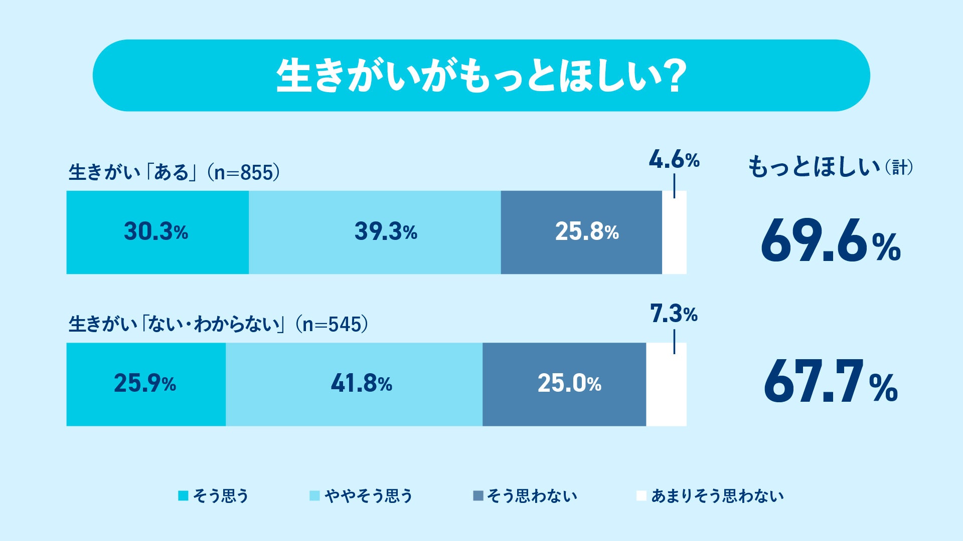 ◆生きがいが「ある」人も「ない・わからない」人も、同様に約7割が「もっと生きがいがほしい」