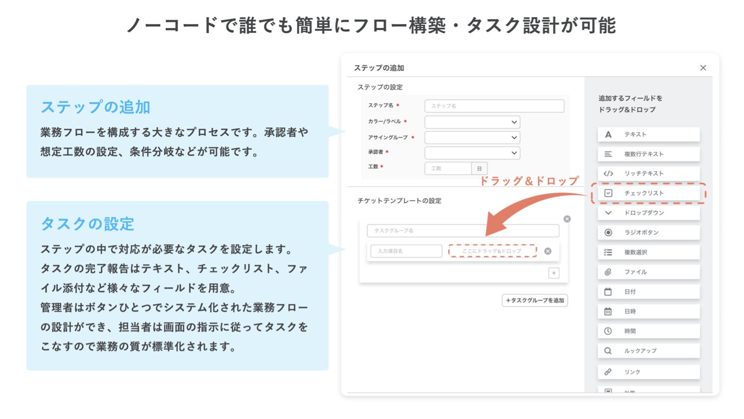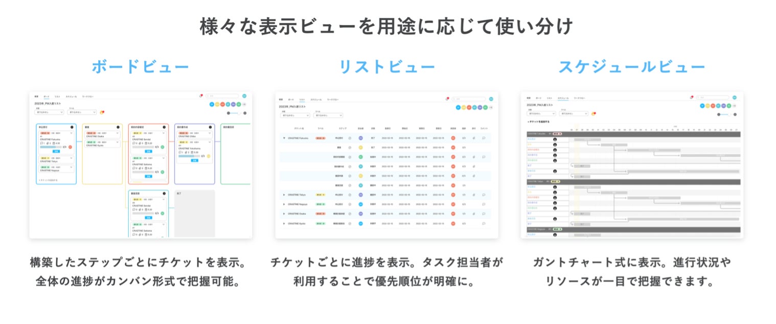 「フローラ」は、各業務のステップに応じて「チケット」と呼ばれる課題やタスクを柔軟に追加できるシステムであり、ユーザーはノーコードの簡単な操作で業務フローを構築できます。また、発行されたチケットの数や処理された数を簡単に確認できるため、業務の進捗状況を迅速に把握できます。これにより、業務内容や管理方法にバラつきがあった不動産の管理と運用業務を効率化しました。