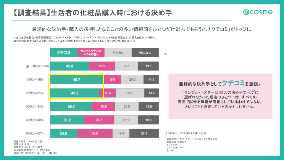 アイスタイルが昨年外部調査で実施した化粧品に関するアンケートでも、「化粧品購入時における決め手」として【クチコミ】を選択する割合がトップになっており、「サンプル・テスターのお試し」を抜いています。