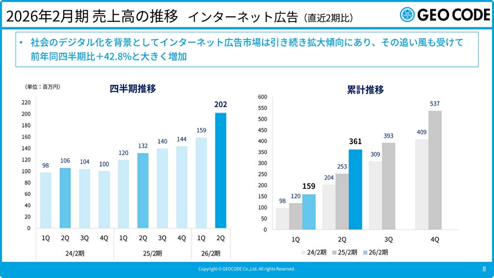 2024年のインターネット広告費の国内市場規模は3兆6,517億円(前年比109.6%)となっており、社会のデジタル化を背景に市場の拡大が継続しています。当社のインターネット広告事業も引き続き好調に推移し、直近2026年2月期 第2四半期の売上高は、前年同四半期比+42.8%と大きく伸長しています。