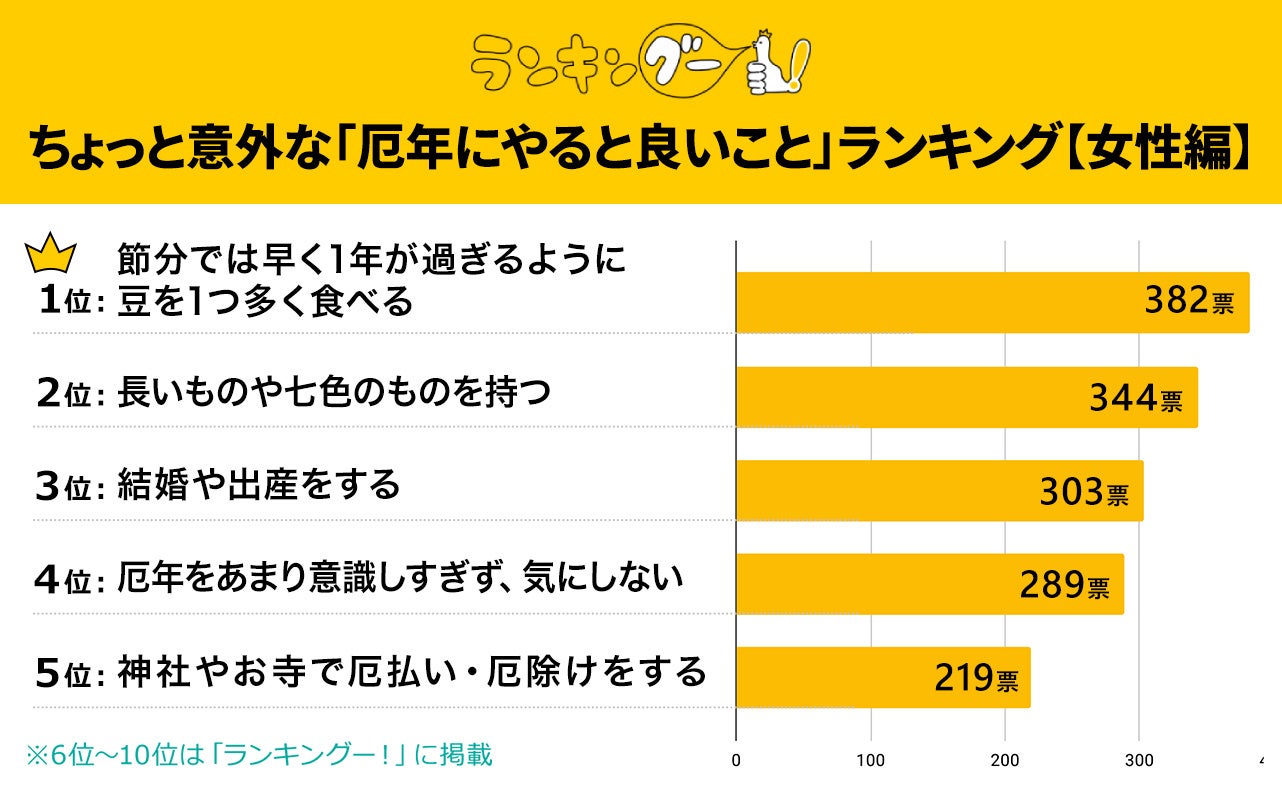 ランキングー!では「厄年にやると良いこと」をピックアップし、ランキングを調査。全年代の女性2,821名にアンケートを行い、TOP10を決定しました。ここではTOP5をご紹介します。