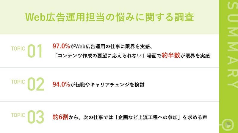 【Web広告運用担当者が抱える悩みとは?】97.0%が「Web広告運用」の仕事に限界を実感...「コンテンツ作成の要望に応えられない」などの本音