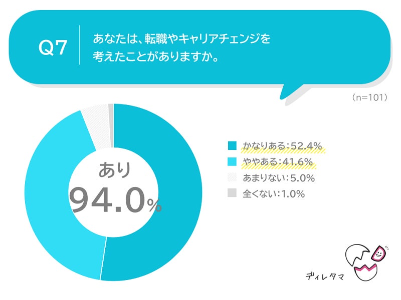 「Q7.あなたは、転職やキャリアチェンジを考えたことがありますか。」(n=101)と質問したところ、「かなりある」が52.4%、「ややある」が41.6%という回答となりました。