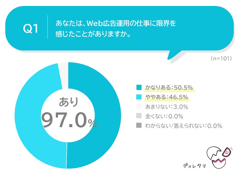 「Q1.あなたは、Web広告運用の仕事に限界を感じたことがありますか。」(n=101)と質問したところ、「かなりある」が50.5%、「ややある」が46.5%という回答となりました。