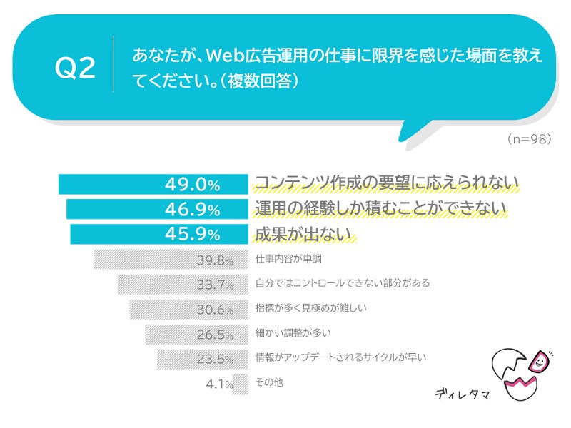 Q1で「かなりある」「ややある」と回答した方に、「Q2.あなたが、Web広告運用の仕事に限界を感じた場面を教えてください。(複数回答)」(n=98)と質問したところ、「コンテンツ作成の要望に応えられない」が49.0%、「運用の経験しか積むことができない」が46.9%、「成果が出ない」が45.9%という回答となりました。