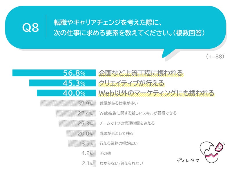 Q7で「かなりある」「ややある」と回答した方に、「Q8.転職やキャリアチェンジを考えた際に、次の仕事に求める要素を教えてください。(複数回答)」(n=95)と質問したところ、「企画など上流工程に携われる」が56.8%、「クリエイティブが行える」が45.3%、「Web以外のマーケティングにも携われる」が40.0%という回答となりました。