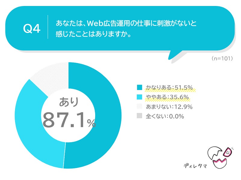 「Q4.あなたは、Web広告運用の仕事に刺激がないと感じたことはありますか。」(n=101)と質問したところ、「かなりある」が51.5%、「ややある」が35.6%という回答となりました。