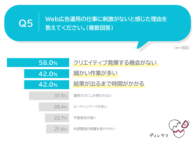 Q4で「かなりある」「ややある」と回答した方に、「Q5.Web広告運用の仕事に刺激がないと感じた理由を教えてください。(複数回答)」(n=88)と質問したところ、「クリエイティブ発揮する機会がない」が58.0%、「細かい作業が多い」が42.0%、「結果が出るまで時間がかかる」が42.0%という回答となりました。