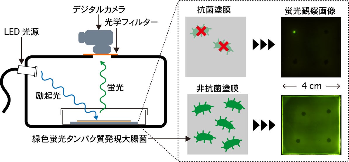 本手法は蛍光タンパク質を発現させた他の細菌種にも幅広く適用することができ、今後、病原性細菌を用いたより実用的な評価が可能になります。本手法を用いることにより、さまざまな抗菌塗膜の性能をより正確に評価し、また、リアルタイムでその効果を可視化することで製品の普及を促進し感染症予防に貢献することが期待されます。