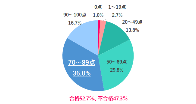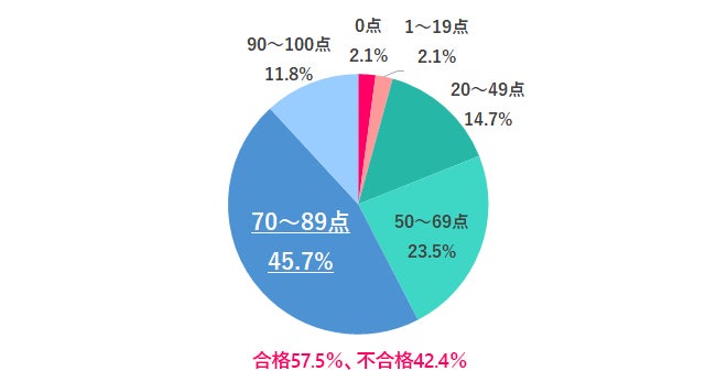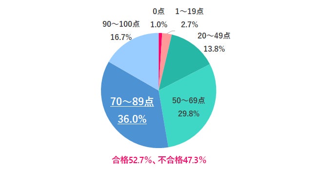 2021年「プライベート」で自分に点数をつけるなら何点か尋ねると、「70~89点」が最も多く36.0%で「90~100点」の人も含めると52.7%の人が自分に合格点をつけています。平均は63.9点で「仕事面」の平均点63.8点とほぼ同じですが、「70~89点」がー9.7%、「50~69点」が+6.3%となるなど、不合格(69点以下)をつける人の割合が約5%多い結果となりました。