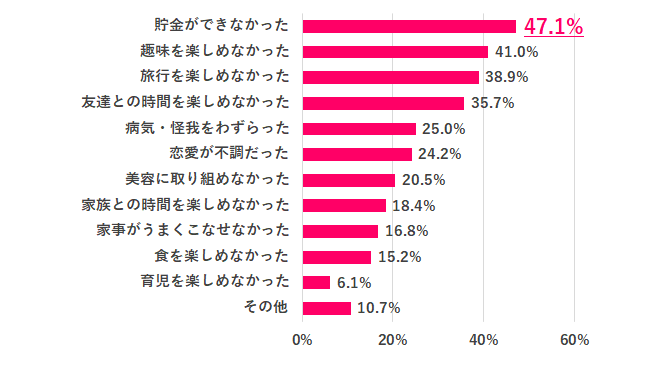 一方プライベートで不合格の点数をつけた人の理由では、1位「貯金ができなかった」47.1%、2位「趣味を楽しめなかった」41.0%、3位「旅行を楽しめなかった」38.9%となりました。趣味については、合格点の理由1位でもありながら、不合格の理由2位でもランクイン。コロナ禍でも楽しめる趣味を持っている人と、コロナ禍では楽しみづらい趣味を持っている人で満足度に差が出たのではないかと考えられます。