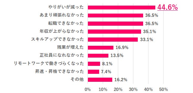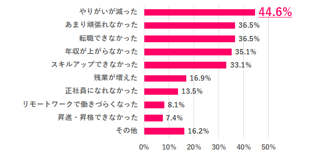 不合格の点数をつけた理由は、1位「やりがいが減った」44.6%、2位は「あまり頑張れなかった」「転職できなかった」が同率で36.5%となりました。