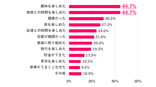 プライベートで合格点を付けた人に理由を尋ねると、「趣味を楽しめた」「家族との時間を楽しめた」が44.7%で同率の1位となり、3位は「健康だった」30.2%となりました。コロナ禍でおうち時間が増えた人も多かったとみられ、フリーコメントでも「投資をはじめられた」「資格取得できた」などの意見がみられました。