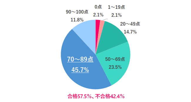 『女の転職type』会員に、2021年「仕事面」で自分に点数をつけるなら何点か尋ねると、「70~89点」が最も多く45.7%でした。「90~100点」の人も含めると57.5%の人が自分に合格点をつけています。平均は63.8点でした。