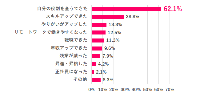 合格点をつけた人に理由を尋ねると、「自分の役割を全うできた」62.1%が断トツ1位で、2位の「スキルアップできた」28.8%や、3位の「やりがいがアップした」13.3%とも大きな差がつきました。