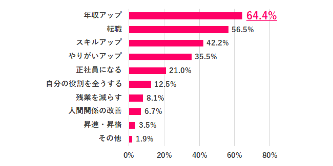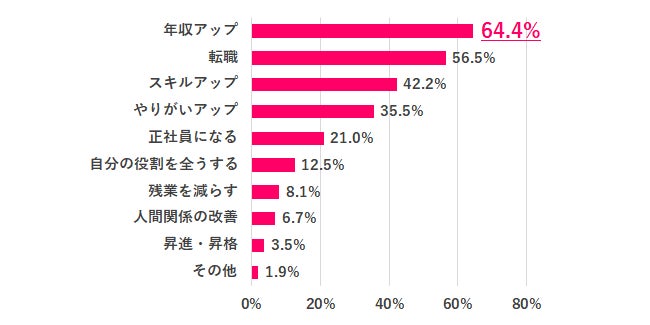 2022年「仕事面」の抱負は、1位「年収アップ」64.4%、2位「転職」56.5%、3位「スキルアップ」42.2%となりました。2021年「プライベート」での不合格理由1位だった「貯金ができなかった」を払拭するためにも、年収アップや転職に意欲を示している人が多いことが予想されます。