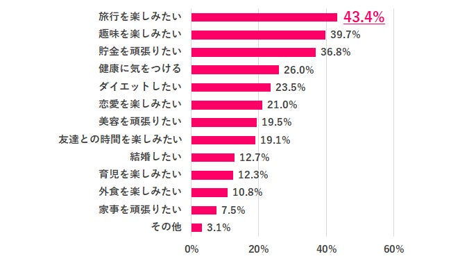 2022年「プライベート」の抱負は、1位「旅行を楽しみたい」43.4%、2位「趣味を楽しみたい」39.7%、3位「貯金を頑張りたい」36.8%となりました。2022年こそは新型コロナウィルスが収束して旅行や趣味を楽しみたいと考える人が多い結果となりました。