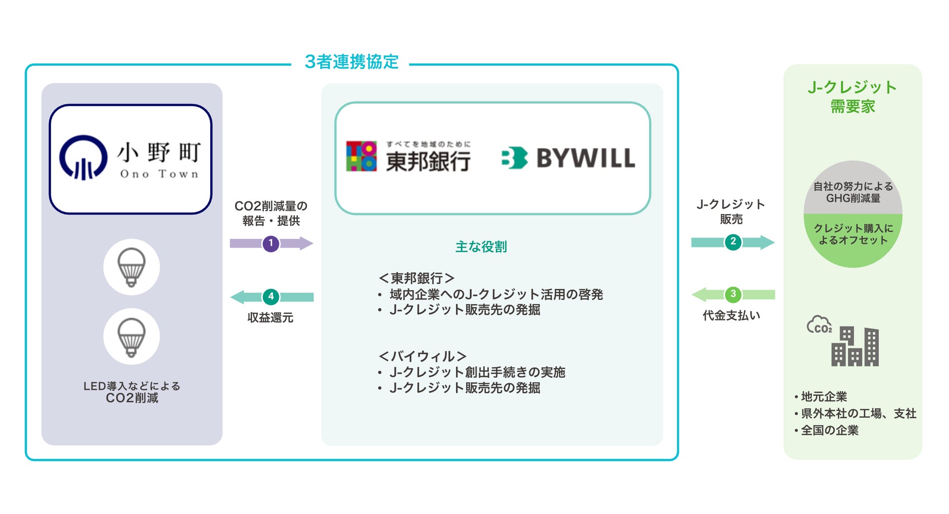 バイウィルは、小野町におけるJ-クレジット創出プロジェクトの登録・申請からモニタリング、創出したクレジットの販売までをシームレスに支援します。また、販売に関しては、東邦銀行とも協力し、「地産地消」によって小野町をはじめとする地域の脱炭素化を促進します。