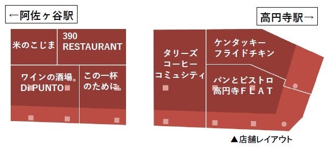 「ミュージシャン」「芸人」発掘の場を設けた「390 RESTAURANT」や、「アートと地域情報の発信基地」というコンセプトの「タリーズコーヒー・コミュシティ」などの高円寺文化を発信するショップが誕生。また、お米にこだわった食事の「米のこじま」、この一杯のために最高の肴をご提供する「この一杯のために」、店舗で焼き上げるパンやケーキとカジュアルフレンチ「パンとビストロ 高円寺FLAT」など、こだわりぬいたショップ7店がオープンいたします。