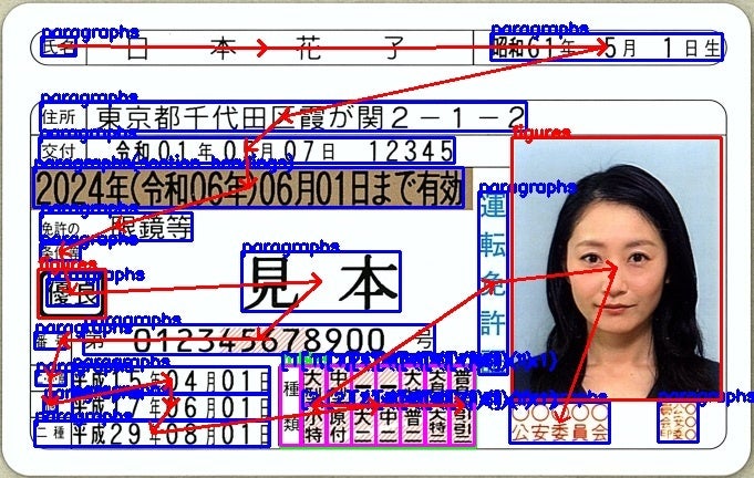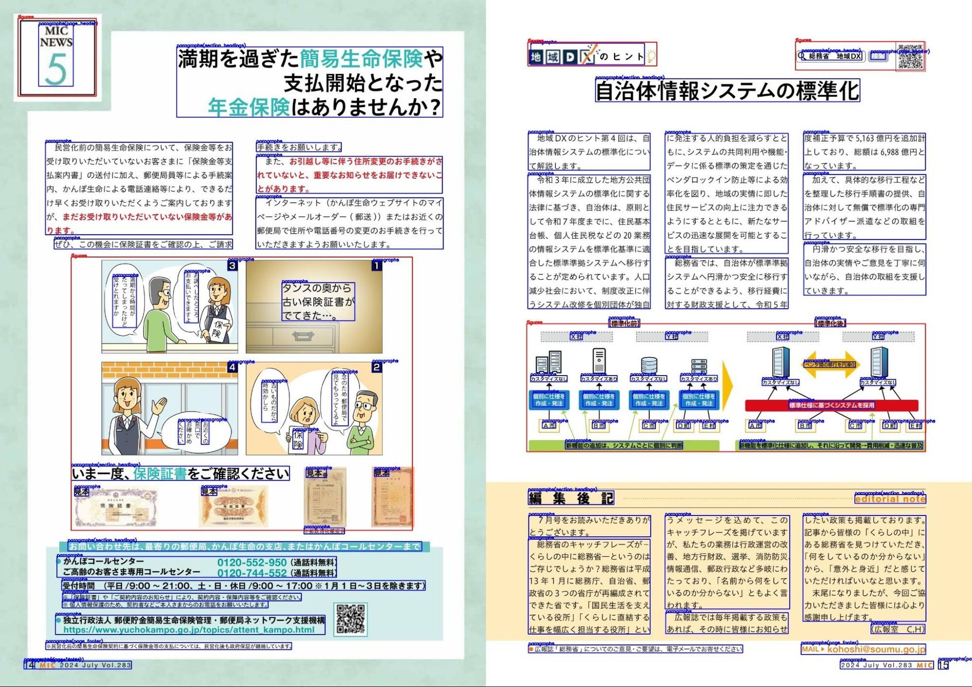 文書画像のレイアウト解析AIを活用し、文書に含まれる図表、画像、段落などの構成要素の位置を正確に特定します。また、表の構造解析AIにより、従来の画像処理では困難だったセル結合が含まれる表やセルの区切り罫線がない表に対しても、表構造を適切に認識し、出力することが可能です。
