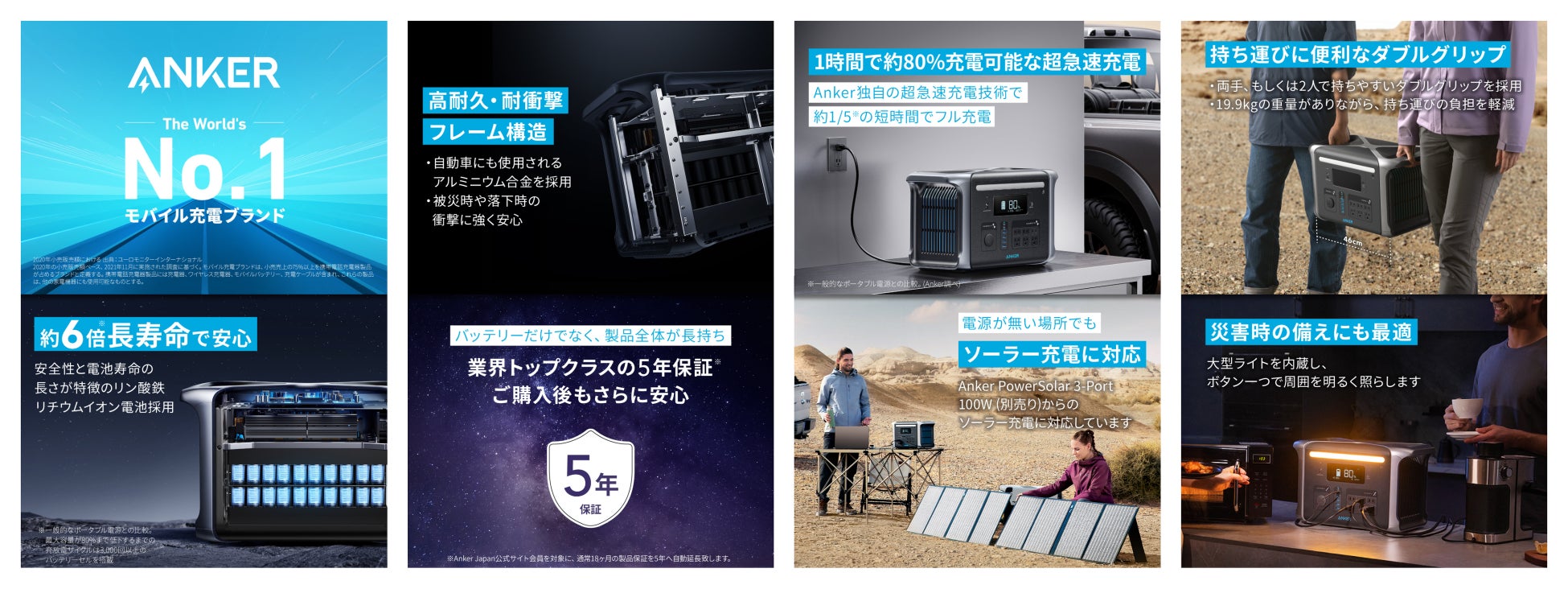 - 高い耐久性と安心の長期保証:自動車にも使われる6000系アルミニウム合金をメインフレームに採用し、災害や落下などの予期せぬ衝撃にも高い耐久性を実現。また、ご購入後も最大5年 (※) の保証期間を設けており、安心して長期間ご使用いただけます(※正規販売店からの注文に限り18ヶ月保証の対象となり、本製品に限りAnker Japan公式オンラインストア会員登録で、+42ヶ月の延長保証が付きます) 。