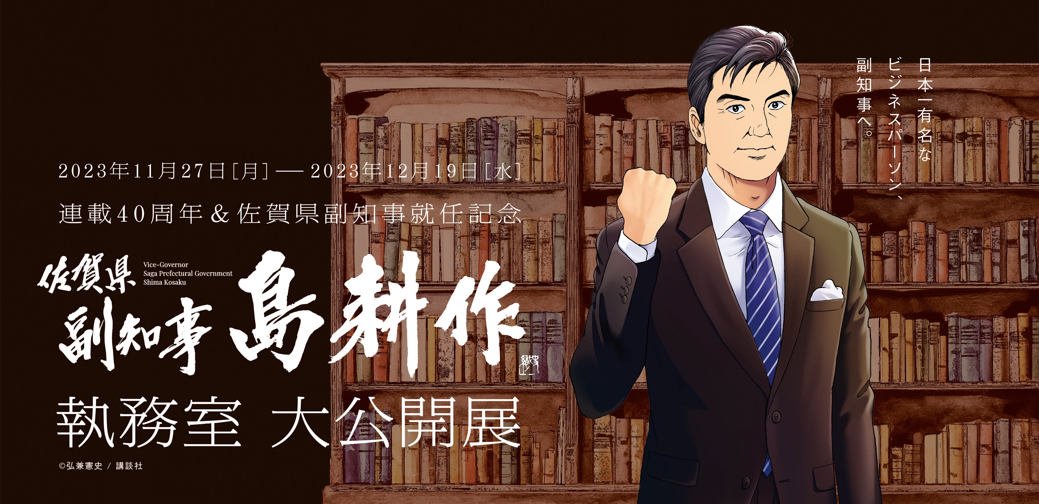また、スポーツの裾野を広げるために講談社のスポーツマンガ約750冊を積んだ「スポーツマンガ号」が東京都内や佐賀県内を巡行するほか、佐賀県庁内に島耕作の執務室を設置。「島耕作シリーズ」の複製原画や連載40周年の軌跡を辿る“島耕作クロニクル“、実際に動いて話す”Live2D 島耕作”を展示する「副知事 島耕作の執務室大公開展」などを併せて開催します。