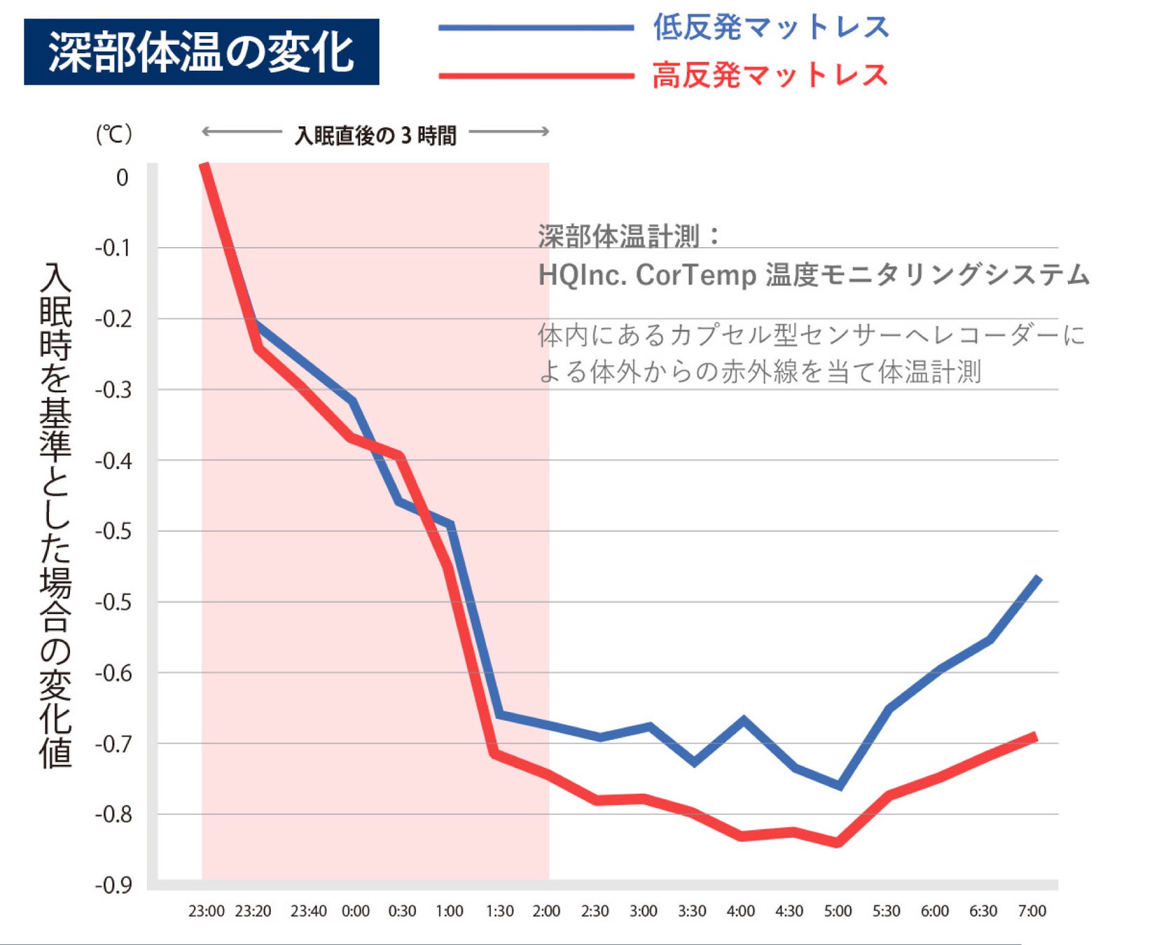 一方の低反発ウレタンマットレスは、深い眠りが訪れるものの、寝具内のムレにより体温が上下を繰り返し、中途覚醒を誘発していることが認められます。