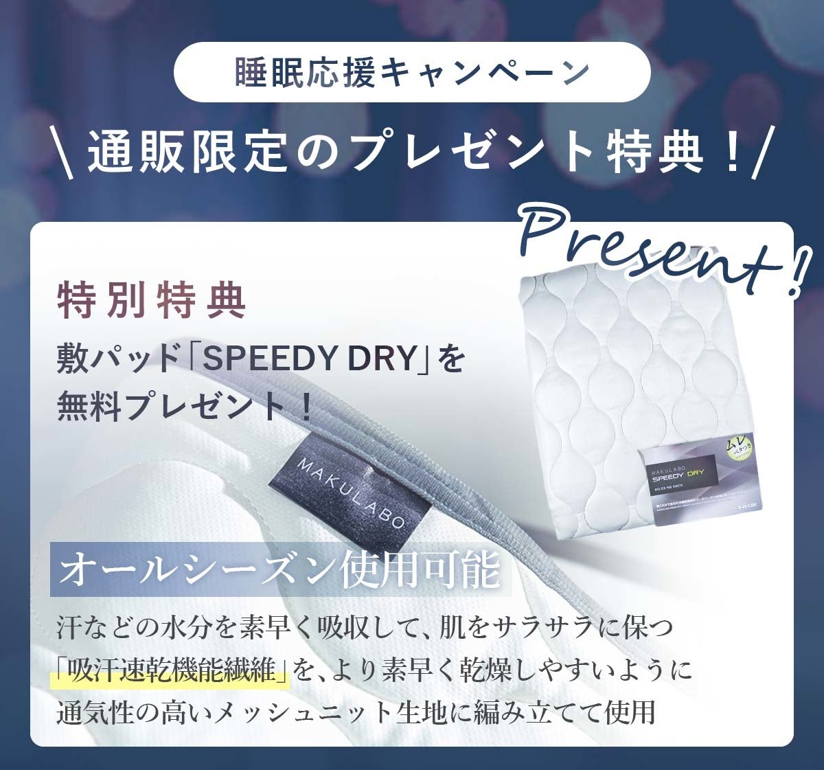 マットレスのご購入で「SPEEDY DRY」敷きパッドをプレゼントする大変お得なキャンペーンです。