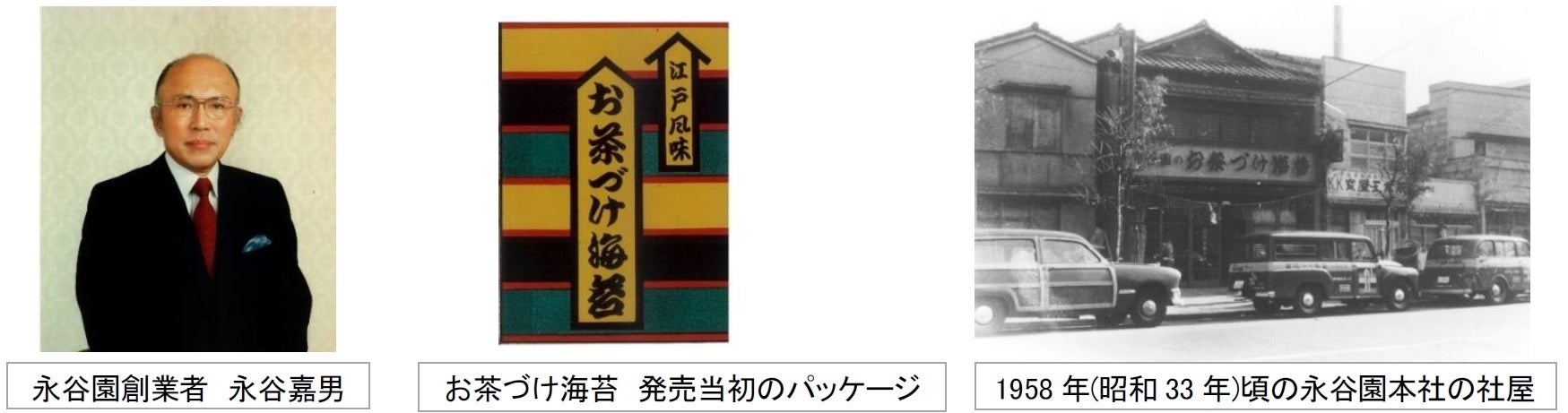 成させました。 ただ、風味と食感のメリハリが欲しいと思っていたところ、嘉男の父・武蔵の故郷である京都ではあられにお湯をかけて食べる「 ぶぶ漬け」というものがあることを思い出し、お茶漬けの素に あられを加え、「お茶づけ海苔」は完成し、1952年に発売しました。発売すると予想を上回るヒット商品となり、翌1953年、嘉男が社長、父武蔵を会長として、お茶づけ海苔の製造販売を行う「株式会社永谷園本舗(現永谷園ホールディングス)」 を設立 しました 。