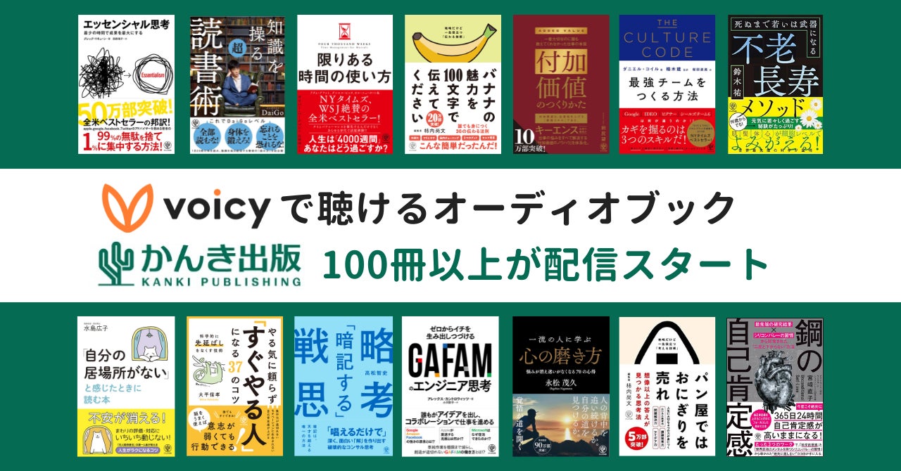 株式会社Voicyが運営する音声プラットフォームVoicyは、4月22日よりかんき出版のオーディオブック109冊の販売を開始しました。『エッセンシャル思考』『限りある時間の使い方』といったベストセラーや、Voicyパーソナリティの著書オーディオブックも多数配信されています。Voicyは、今後も声で学べるプラットフォームとして音声コンテンツの幅を広げていきます。