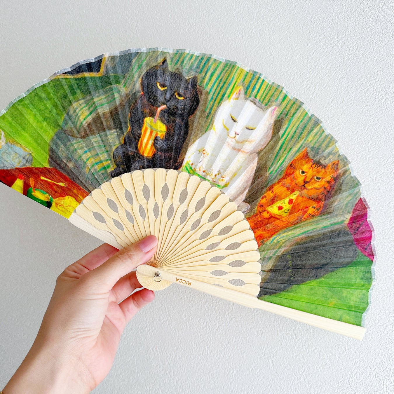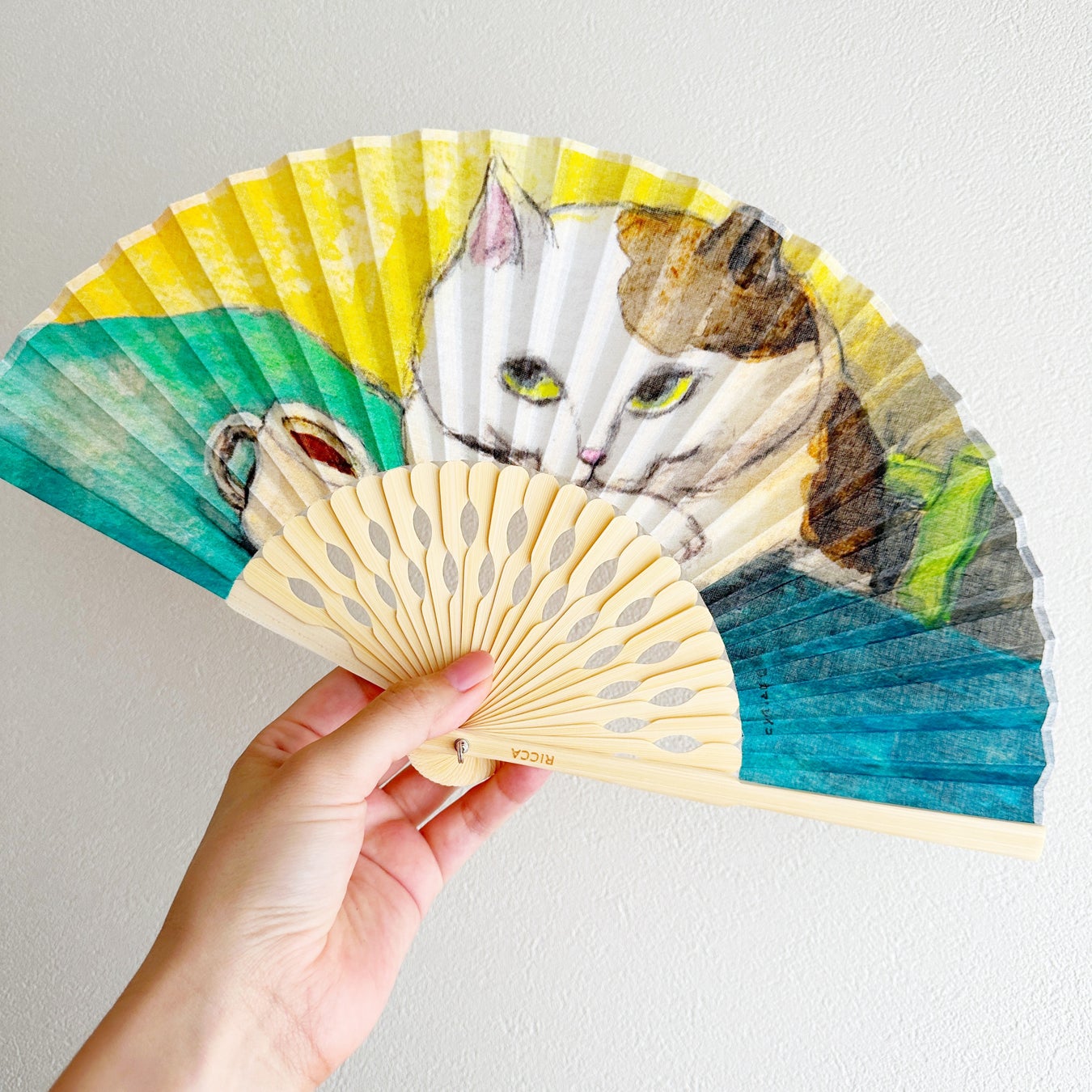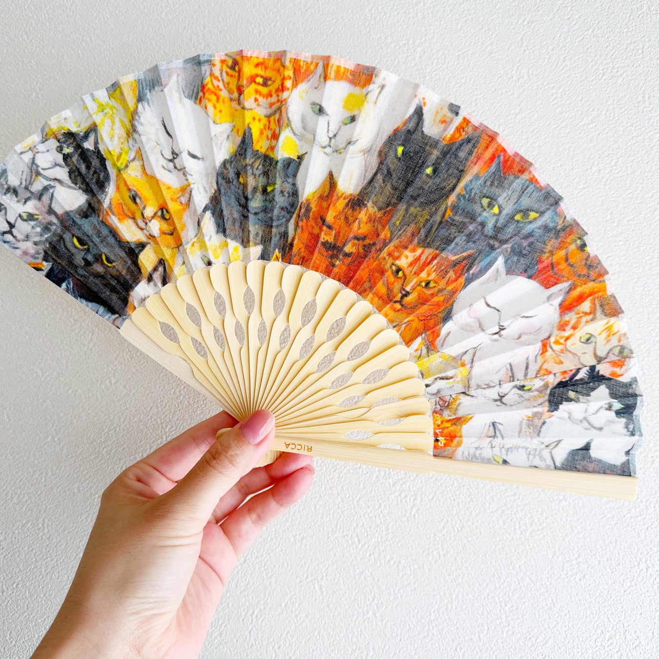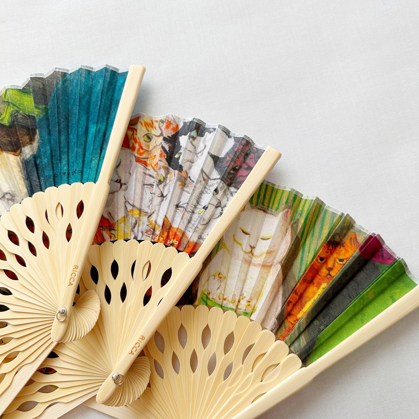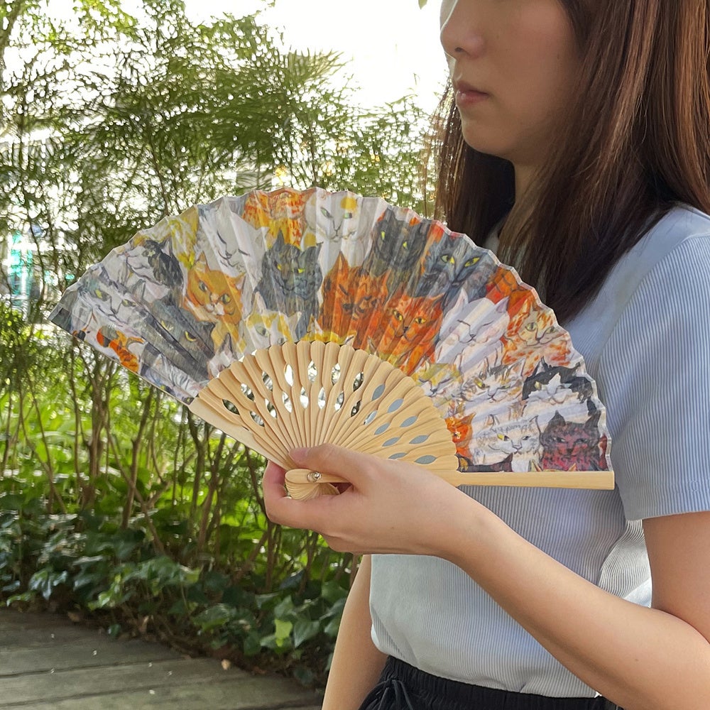 ぱっと広げると、鮮やかなアートが広がる扇子。表情豊かでクスッと笑ってしまうような猫たちの日常のワンシーンを切り取ったカマノレイコさんの作品を、鮮明なプリントで表現しています。