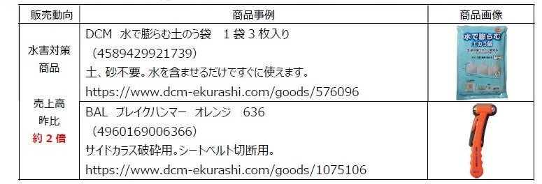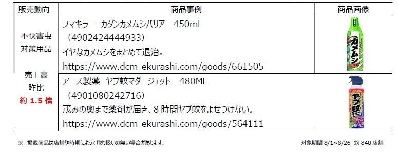 8月は、台風の接近や局地的大雨が多発したことから、水害対策商品が伸長しました。また、カメムシやヤブ蚊などの活動が活発な時期となり不快害虫用殺虫剤が伸長しました。